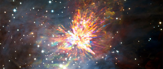 500 ans plus tard, une équipe d’astronomes emmenée par John Bally (Université du Colorado, Etats-Unis), a utilisé le Vaste Réseau (Sub-)Millimétrique de l’Atacama (ALMA) pour sonder le coeur de ce nuage. Ils y ont découvert les débris éjectés lors de la naissance explosive de cet amas d’étoiles massives, semblables aux vestiges de feux d’artifice cosmiques constitués d’énormes jets de matière omnidirectionnels. Ce type d’explosions est censé être de courte durée – à titre d’exemples, les vestiges observés par ALMA demeureront quelques siècles seulement. Bien qu’éphémères, ces explosions protostellaires sont peut-être relativement fréquentes. En détruisant leur nuage parent, ces événements peuvent contribuer à réguler le taux de formation stellaire au sein de ces immenses nuages moléculaires. La nature explosive des débris qui parsèment OMC-1 fut pour la première fois suspectée en 2009, après que des observations aient été effectuées au moyen du Réseau Submillimétrique d’Hawaï. Bally et son équipe ont également observé cet objet dans le proche infrarouge grâce au télescope Gemini South implanté au Chili. Sur ces clichés figure la remarquable structure des jets de matière, qui s’étendent sur près d’une année lumière.
