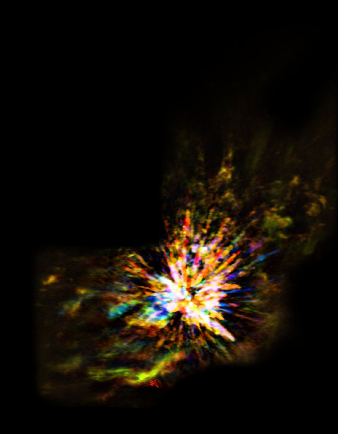 Toutefois, les nouvelles images acquises par ALMA témoignent de cette nature explosive en haute résolution, révélant de précieuses informations relatives à la distribution ainsi qu’au déplacement, à vitesse soutenue, du gaz de monoxyde de carbone (CO) à l’intérieur des jets. Ces données permettront aux astronomes de mieux comprendre l’origine de la puissance de l’explosion, ainsi que l’impact de tels événements sur la formation stellaire au sein de la galaxie.