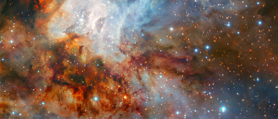 Sur cette photographie figure l’amas d’étoiles RCW 38 capturé par l’imageur infrarouge HAWK-I qui équipe le Very Large Telescope (VLT) de l’ESO au Chili. Sa capacité à observer aux longueurs d’onde infrarouges permet à HAWK-I d’étudier les amas d’étoiles poussiéreux semblables à RCW 38, et notamment la formation d’étoiles en leur sein. Cet amas est composé de centaines de jeunes étoiles chaudes et massives. Il se situe à quelque 5500 années lumière de la Terre dans la constellation de Vela (Les Voiles). Les régions centrales de RCW 38 apparaissent brillantes, teintées de bleu. Elles sont peuplées de nombreuses très jeunes étoiles ainsi que de protoétoiles en cours de formation. Ces étoiles nouvellement nées émettent un rayonnement intense qui fait briller le gaz environnant. Cette luminosité induite contraste nettement avec la faible lueur rouge-orangée qu’arborent les filaments de poussière cosmique qui traversent cette zone. S’ensuit cette scène remarquable, véritable oeuvre d’art celeste.