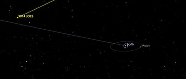 Le 19 avril prochain l’astéroïde 2014 JO25 passera à 1,8 millions de kilomètres de nous soit un peu moins de 5 fois la distance entre la Terre et la Lune. Les mesures effectuées par la mission NEOWISE de la NASA indiquent que l’astéroïde a une taille relativement importante d’environ 650 mètres et que sa surface est environ deux fois plus réfléchie que celle de la lune. Découvert en 2014 par l’astronome britannique Ron Baalke sa trajectoire est bien connue. Son prochain passage sera environ dans cinq siècles. Il ne représente pas une menace pour la Terre mais il est relativement rare qu’un aussi gros astéroïde passe si près de nous. La prochaine visite d’un astéroïde comparable en taille devrait avoir lieu en 2027. Les astronomes amateurs devraient arriver à pouvoir l’observer avec des petits télescopes . Il sera surveillé par la NASA qui espère en apprendre d’avantage sur sa composition.
