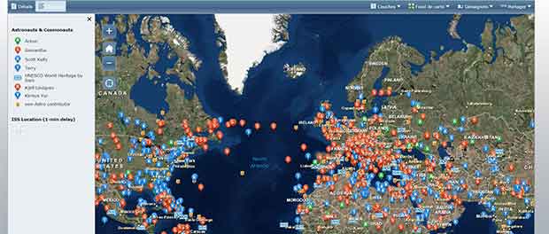 Les astronautes de la station spatiale prennent régulièrement des photos de la Terre depuis l’ISS. Une carte interactive a été mise en ligne avec l’emplacement de ces images. Elle permet de se balader sur la planète en parcourant les photos, le site propose différentes options et il indique l’astronaute qui a pris la photo. Vous pouvez par exemple ne sélectionner que les photos de Samantha Cristoforetti ou de Scott Kelly et choisir une zone géographique. Le site est mis à jour régulièrement étant alimenté directement par les comptes Twitter des astronautes. Les photos étant extrèmement nombreuses, la carte les affiche par expéditions. Dans la rubrique « Détails » vous pouvez sélectionner celle qui vous intéresse. Nous vous proposons par défaut celle de l’Expédition 50 avec Thomas Pesquet.