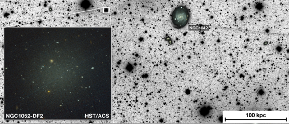 La région entourant la galaxie NGC 1052 imagée par le Dragonfly Telephoto Array, les galaxies DF2 et DF4 sont zoomées (images du télescope Hubble) (Dokkum et al.)