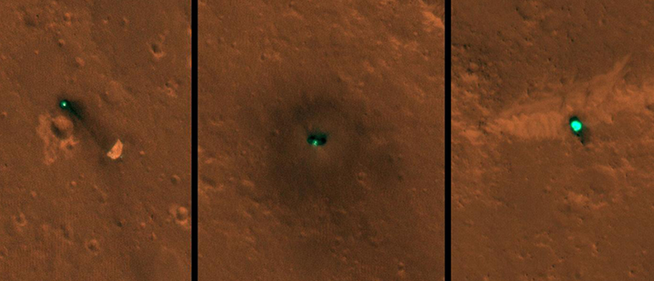 Après avoir retrouvé Opportunity en septembre dernier, la caméra HiRISE, qui équipe l’orbiteur Mars Reconnaissance Orbiter (MRO) de la NASA, a observé InSight depuis l’espace. Les images ont été prises les 6 et 11 décembre 2018. On peut découvrir l’atterrisseur mais aussi plusieurs éléments comme le parachute. Les caractéristiques du paysage martien apparaissent dans les images publiées aujourd’hui. Ce n’est pas leur couleur réelle: la lumière réfléchie par leurs surfaces provoque la saturation de la couleur. Le sol autour d’InSight apparaît sombre à cause de la poussière dégagée durant l’atterrissage. Recherchez une forme de papillon et vous pourrez distinguer les panneaux solaires de l’atterrisseur de chaque côté. Les petits points lumineux correspondent aux panneaux solaires qui ont été déployés, on peut également voir l’ombre sur la surface. L’atterrisseur a une largeur d’environ 6 mètres lorsque ses panneaux sont complètement déployés.