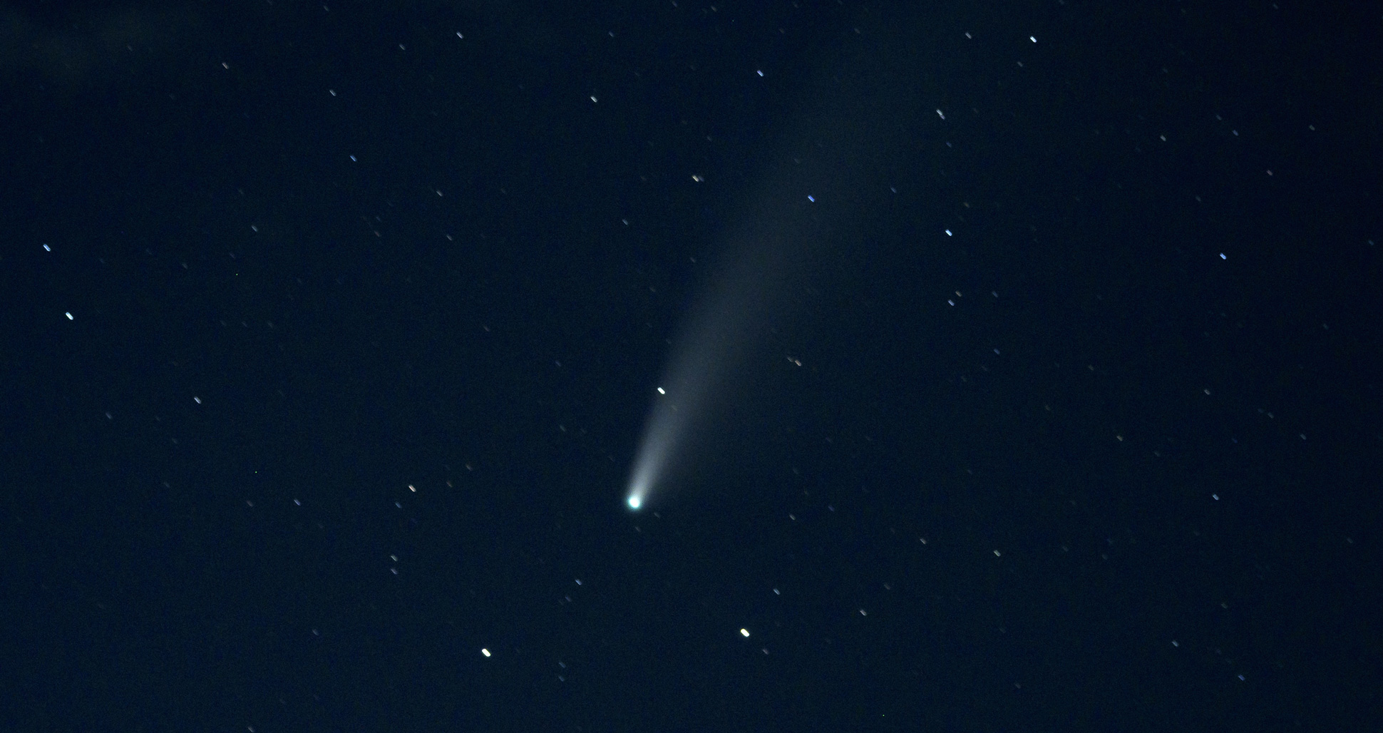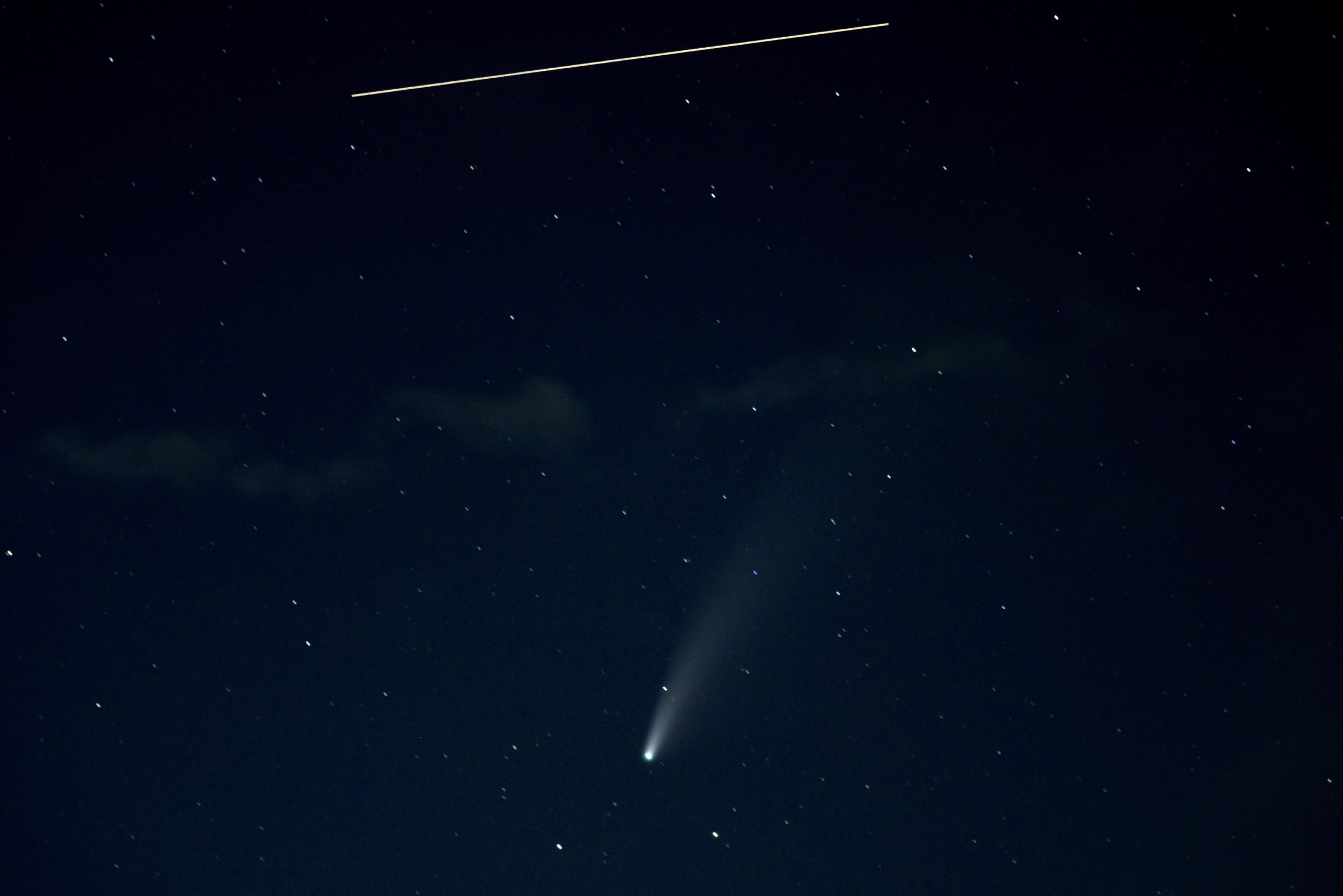 The @Space_Station makes a sweeping, high pass as it orbits around our world, while Comet #NEOWISE continues on its celestial journey into the cosmos. ☄️ pic.twitter.com/qCNvBsN6Y2