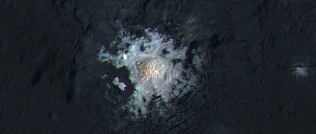 La NASA a publié le 22 mars dernier une nouvelle image de la tache brillante au centre du cratère Occator. Les couleurs ont été rehaussées pour faire ressortir les différences. Elle a été réalisée à partir des photos de la sonde spatiale Dawn obtenues en septembre 2015 et en février 2016. On constate que le centre du cratère est une sorte de dôme de 2 km de large.