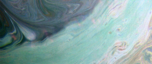 La NASA a publié le 9 août 2016 une image montrant les nuages de Saturne en infrarouge. La photo a été prise le 20 juillet 2016 par la sonde spatiale Cassini. Ce genre de filtre infrarouge permet aux scientifiques d’étudier l’atmosphère, les caractéristiques et la profondeur de ses nuages de la géante gazeuse aux anneaux. Cette image à un coté psychédélique qui ne déplairait pas à un hippie mais elle est bien réelle. Elle aurait probablement été utilisée pour une pochette d’album de musique durant la période flower power.