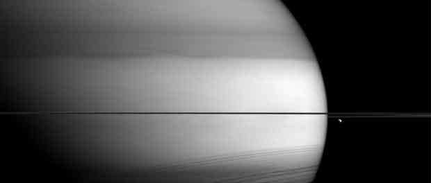 Cette image de Saturne et la petite Dione sous les anneaux a été prise par la sonde spatiale Cassini le 6 septembre 2015. La petite lune avec ses 1123 km de diamètre semble toute minuscule à côté d la géante gazeuse . La photo a été prise dans des longueurs d’onde pour analyser le méthane de la géante aux anneaux. Les parties les plus sombres sont celles où la concentration du méthane est la plus élevée. La sonde se trouvait à 1,33 millions de km de Saturne.