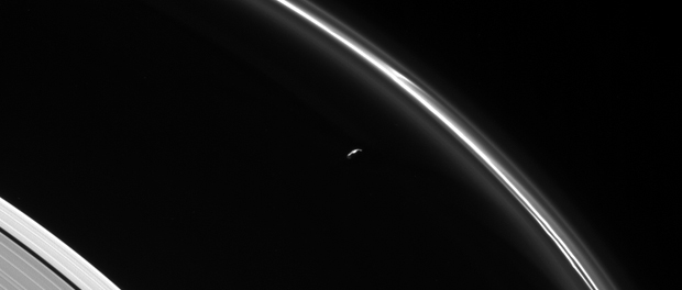La NASA a publié le 7 août 2017 une nouvelle photo montrant Prométhée et l’anneau F de Saturne. Cette anneau, situé à 140 000 km de la planète, est très fin. Il est encadré par deux satellites bergers, Prométhée à l’intérieur et Pandore à l’extérieur. Ils confinent l’anneau F avec leur gravité. Cette superbe image a été prise par la sonde Cassini le 13 mai 2017 à une distance de 1,1 millions de kilomètres.
