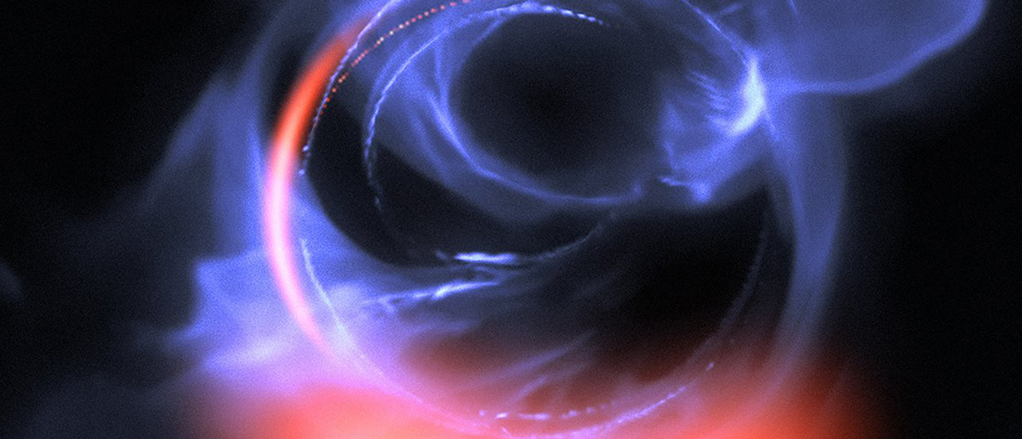 Cette visualisation se base sur des données issues de simulations de mouvements orbitaux de gaz tourbillonnant à environ 30% de la vitesse de la lumière sur une orbite circulaire encerclant le trou noir.